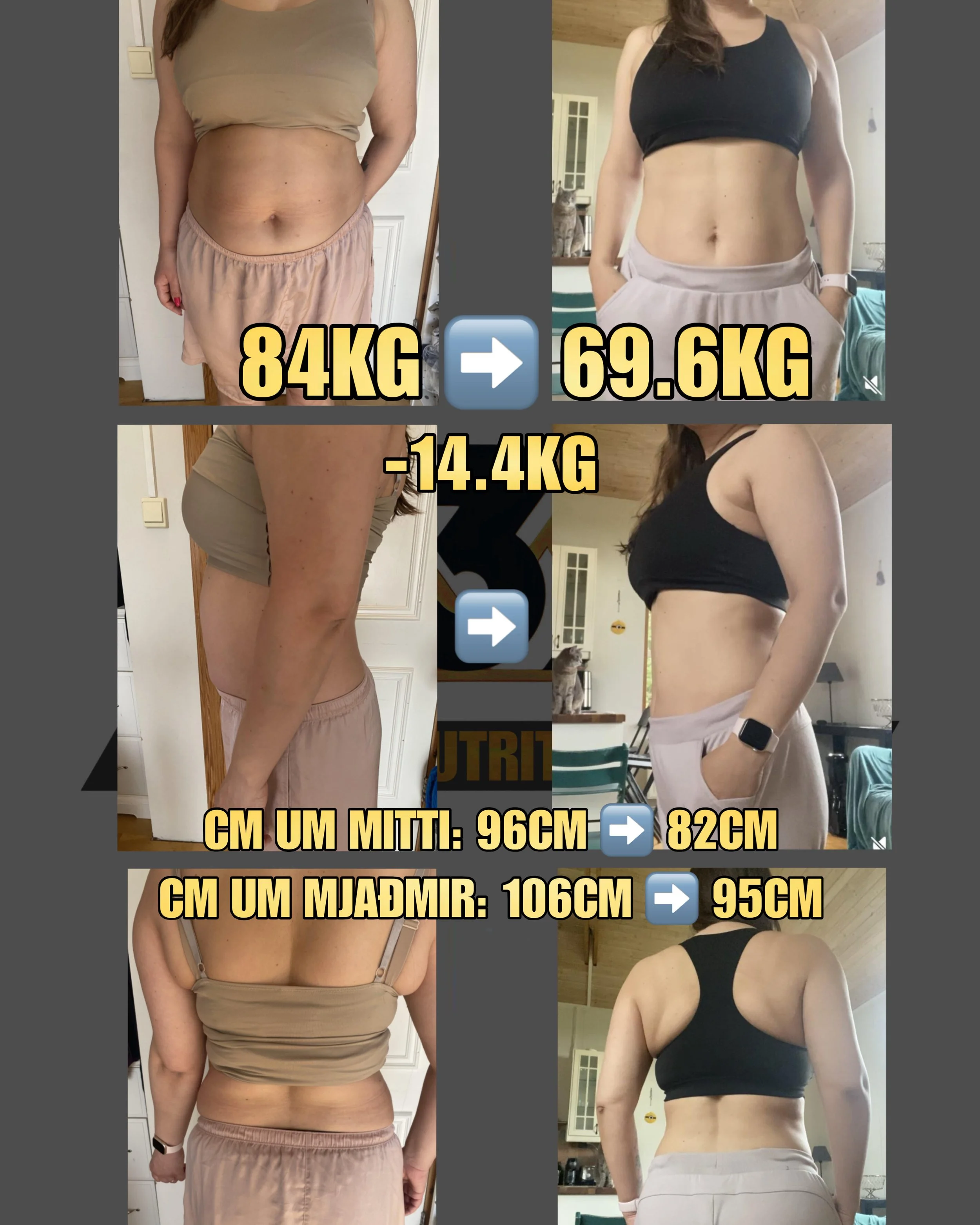 “Ég byrjaði að vinna með Theodóri í maí 2025, þá vó ég 84kg (166cm á hæð) Í morgun (28.08.2025) var þyngdin mín komin niður í 69,6kg.